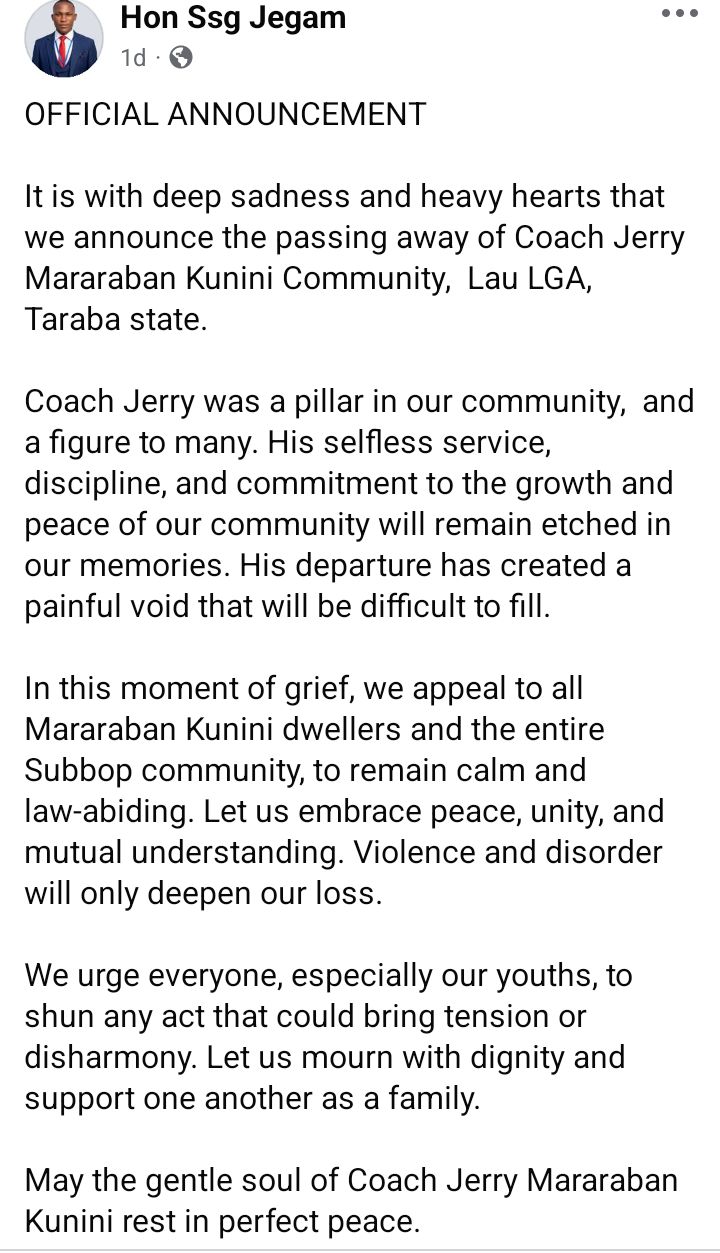 “The Taraba State Police Command wishes to inform the general public that today, 14th April 2026 at about 0900 hours, the Commissioner of Police, CP Moorkwap Sebastian Dongshal psc(+), visited the scene of a tragic incident at Mararaban Kunini, Lau Local Government Area for an on-the-spot assessment,” the statement read.