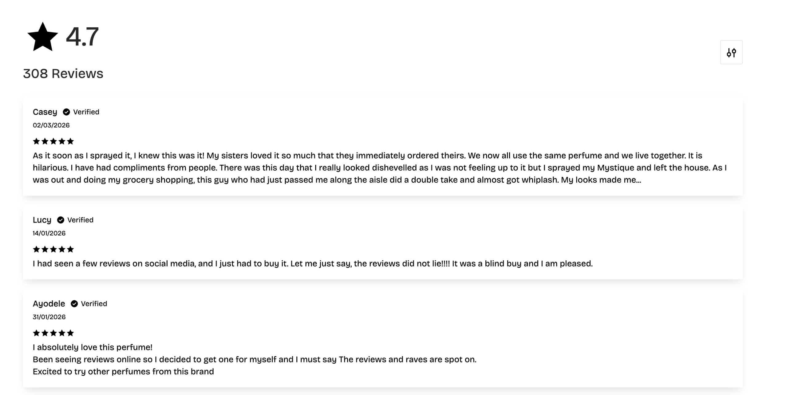 “I’ve tried Tom Ford Black Orchid and a few other high-end options, but Mystique genuinely outlasts them in Lagos heat. I get compliments every time I wear it.” — Verified buyer