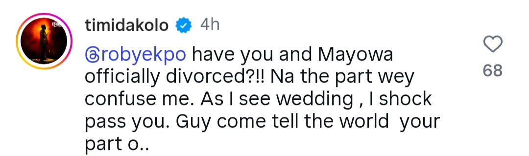 Timi Dakolo, who is friends with Roby, also reacted in shock as he asked Roby when his marriage ended.